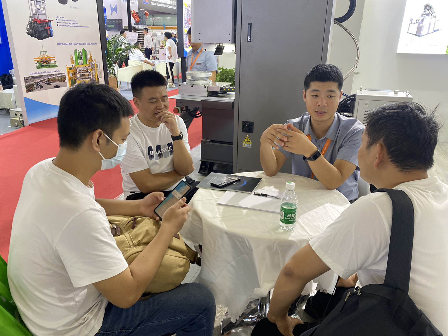 9月4日作为展会开幕的第一天,这一天是最忙碌的,展台前迎来了众多的老朋友和新客户,国内外的客商们纷纷来到展台前参观和交流。温州橡胶协会、玉环橡胶商会的代表们以及全国橡塑中心的领导们均亲临我们公司展位现场,相互探讨交流,气氛热烈,笑声不断。其中安徽客商更是直接给了400吨、250吨等设备的批量采购意向单;郑州客商对我们的长期合作表达了强烈的意愿;丹阳客商则是直接邀请洪总在展会后去丹阳做客洽谈。让人惊喜的是,全国橡塑中心的领导对我们公司所亮相的产品给予了高度的评价,并期望我们持续拓展在业内的品牌影响力和综合竞争优势,引领橡胶机械行业不断向前发展。