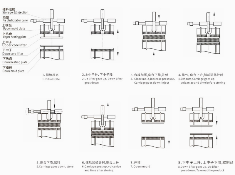 - 先进先出的橡胶螺杆料筒一体化的注射技术和角式注射机构,降低了整机的高度;